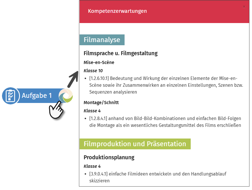 Die in den einzelnen Übungen/Aufgaben angesprochenen bzw. erwarteten Kompetenzen lassen sich mit Tippen auf die farbige Blendengrafik neben der Nummerierung der Aufgaben anzeigen. Die Färbung der Blenden-Elemente zeigt an, welche Kompetenzbereiche von einer Aufgabe angesprochen werden.